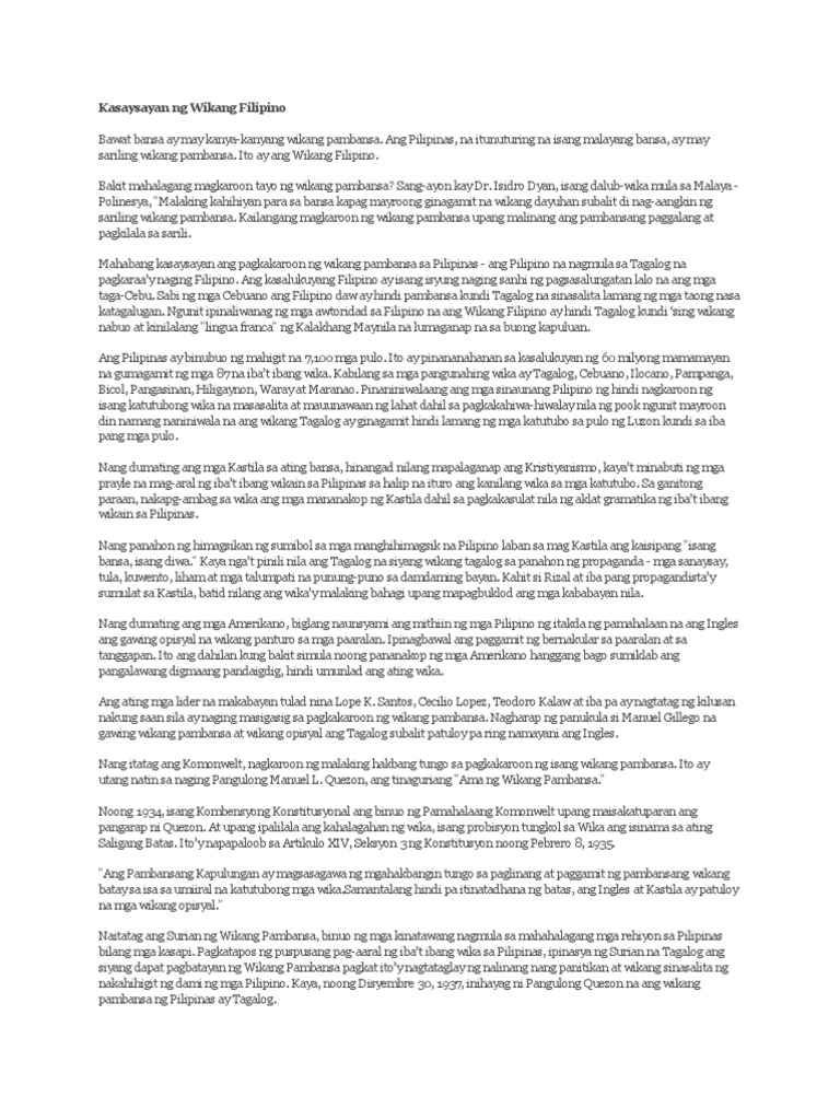 15072016 TIMELINE NG PAG-UNLAD NG KASAYSAYAN NG WIKANG PAMBANSA. 01092016 Ang pangalang Filipino ng ating wikang pambansa ay hindi nagmula sa Ingles na Filipino na tinatawag sa ating mga mamamayan ng Pilipinas. 01082015 At kung yaman din lang ng pambansang wika ang pag-uusapan idiniin ni Delima na aabot na sa 135 wika sa ngayon ang bumubuo sa wikang Filipino at ang bawat wika na ito ay may 5 hanggang 10 diyalekto.